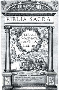 Plantinova Polyglota antverpská (Antwerpen 1569–1573). Biblia sacra hebraice, chaldaice, graece et latine (Antwerpen, Christoph Plantin 1569–1573). Díl první (1569). Vlevo titulní strana značená spojitým monogramem PAME (antverpský rytec Pieter van der Heyden). Vpravo nahoře a uprostřed část pag. 2 s hebrejským a latinským zněním. Vpravo dole část pag. 3 s řeckým zněním (všude počátek Genesis). Královská kanonie premonstrátů na Strahově – Strahovská knihovna (Praha), sign. BY II 1.