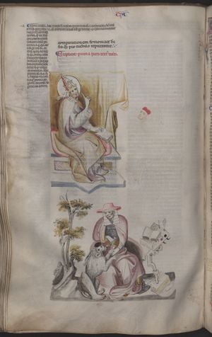 Graciánův dekret (kodex církevního práva) s glosou. Hlavní text je psán ve dvou sloupcích uprostřed zrcadla (na zobrazené stránce jsou v oblasti hlavního textu i obrázky), glosa je zaznamenána okolo hlavního textu menším písmem. Toto rozvržení též zřejmé na prosvítajícím textu z předcházející strany. Vyobrazení: Papež Řehoř Veliký a sv. Jeroným. Lavírované kresby byly patrně v Čechách doplněny v druhé polovině 14. století do staršího boloňského rukopisu (ca 1320). – Decretum Gratiani – München, Bayerische Staatsbibliothek, clm 23553, fol. 115v