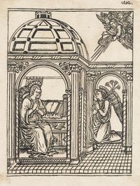 Israel van Meckenem: Madona stojící na půlměsíci (kolorovaný mědiryt, Kleve? 1476). Odpustkový list vydaný papežem Sixtem IV. a signovaný umělcovými iniciálami I. M. vpravo na poslední řádce rytého textu. Nalepeno na zadním přídeští latinského rukopisu Královská kanonie premonstrátů na Strahově – Strahovská knihovna (Praha), sign. DB IV 2.
