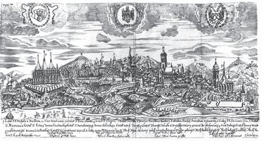Z nejnovější práce Lenky Blažkové (Bártové) vyplývá, že první veduta otištěná u nás přichází v aktualitě O porážce, kteráž se stala u Budína (Praha? 1541). Původně německý text přeložený Matyášem z Lužnice je doplněn titulním dřevořezem, který však není typickou vedutou, nýbrž obrázkem bitvy před městským panoramatem. Obrázek vedle dalších tematicky podobných provázel už Gioviovu Kníhu o věcech a způsobích národu tureckého (Praha 1540), vydanou v Tiskárně severinsko-kosořské. Zatímco v Gioviovi štoček přibližuje neúspěšný pokus Turků dobýt Vídeň (1529), v letáku posloužil jako ilustrace pádu Budína do tureckých rukou (1541). Jiné vyobrazení, totiž město Jeruzalém, přinesl cestopis Oldřicha Prefáta z Vlkanova Cesta z Prahy do Benátek a odtud potom po moři až do Palestiny (Praha 1563).