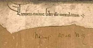 Naproti tomu u vlastnických záznamů bývá majitel rukopisu přesně určen (nedošlo-li – obvykle zásluhou dalších vlastníků – k poškození nebo zničení původního textu). Forma těchto záznamů bývala různá: mohla obsahovat prosté určení osoby nebo instituce, které kodex patřil, mohla ale uvádět i bližší okolnosti jeho opatření (rok, donátora apod.). Již ve středověku některé osoby opatřovaly své knihy shodným grafickým znamením, které tak můžeme označit jako exlibris: např. Václav Hněvsín z Krumlova měl ve svých rukopisech žlutého dráčka v modrém erbu, Václav Koranda mladší užíval monogramy: několik variant kombinací iniciál svého jména V K spojených s písmenem M (označení pro magister). Vlastnické záznamy nemusely být bezprostředně viditelné, proto se obvykle objevují uvnitř rukopisu: nejčastější je opět záznam na předním přídeští, předsádce nebo prvním listu, ale různé instituce měly i své jiné charakteristické umístění: část roudnických rukopisů má vlastnický záznam kolmo ke hřbetu na posledním listu, kodexy kláštera v Sadské měly údaj o majiteli zapsaný na třetí apertuře od začátku a konce kodexu a také přibližně v polovině rozsahu knihy. Neopomenutelné je ale sledování všech vlastnických údajů a signatur, nejen středověkých: dokumentované osudy středověkých knihoven umožňují alespoň s otazníkem zařadit mezi jejich obsah i kodexy, které sdílely stejné mladší osudy, přestože doklady o starším nebo původním majiteli v nich chybějí.